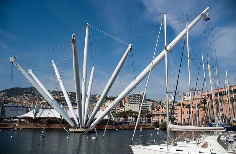 historic port of Genoa - modern sculpture reflecting the old skyline of dockside cranes