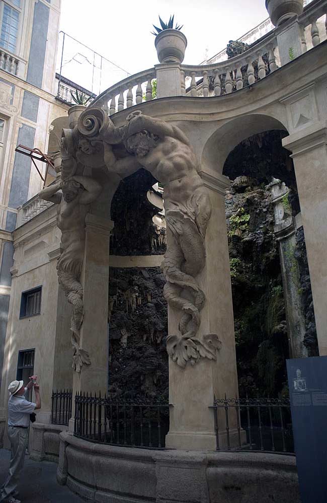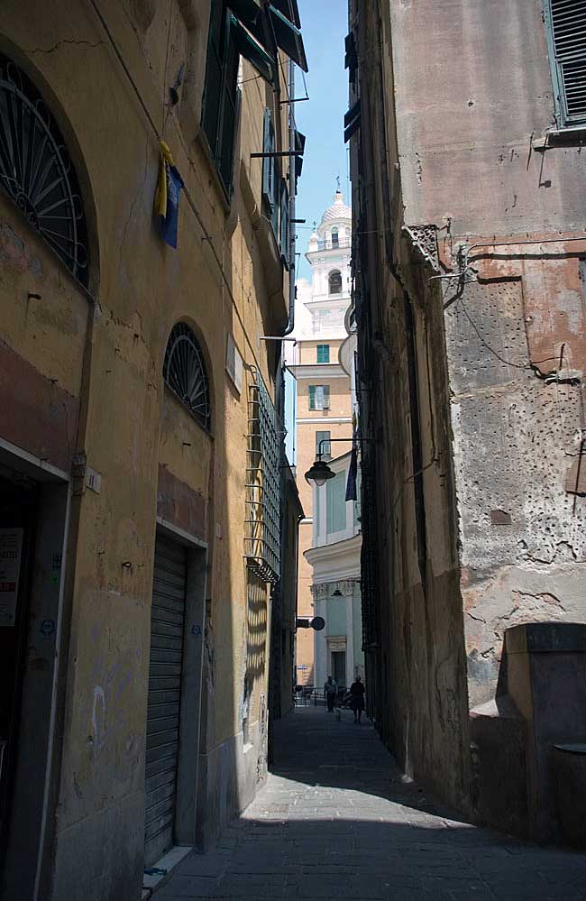 The narrow streets of the old city, Genoa hide magnificent churches (right) and priceless sculptures (left)